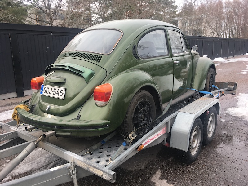 Tänään tuli kuljetusfirman rekka pihaan ja nappasi Kuplan kyytiin. Ikävää asiassa oli se, että nyt käynnistettäessä alkoi taas vuotaa bensaa. Tällä kertaa vuotokohta oli eri. Ovat nuo polttoaineletkut näemmä vanhaa tavaraa. Ilmoitin asiasta ostajalle, joka otti asian ihan luonnollisesti vanhaan autoon kuuluvana normaali asiana, niinkuin harrastajan kuuluukin.